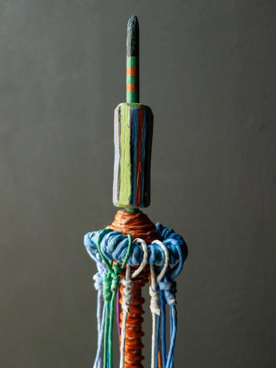 A collection of colorful wooden sticks and strings organized vertically, resembling a handmade sculpture or craft project.