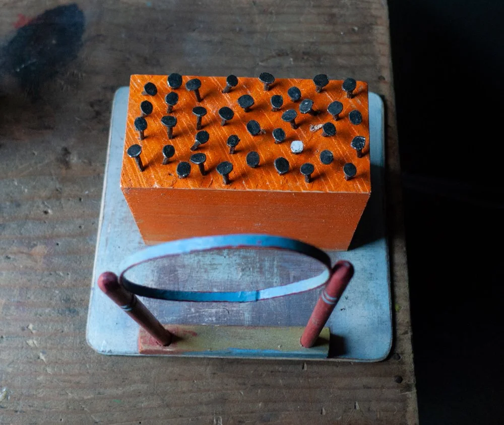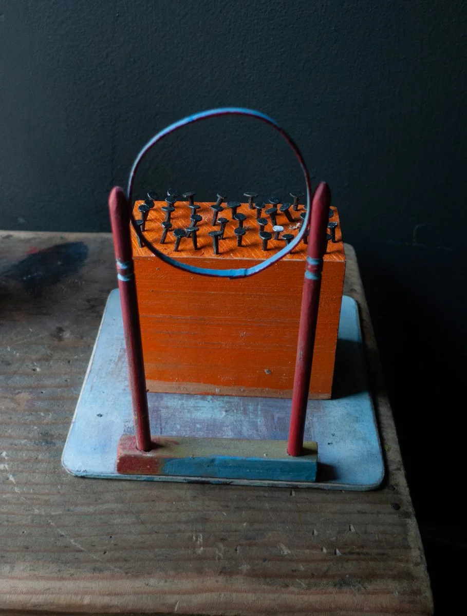 A vintage wooden and metal mechanical puzzle with a circular metal ring held between two red metal rods, resting on a blue wooden base on a wooden table.