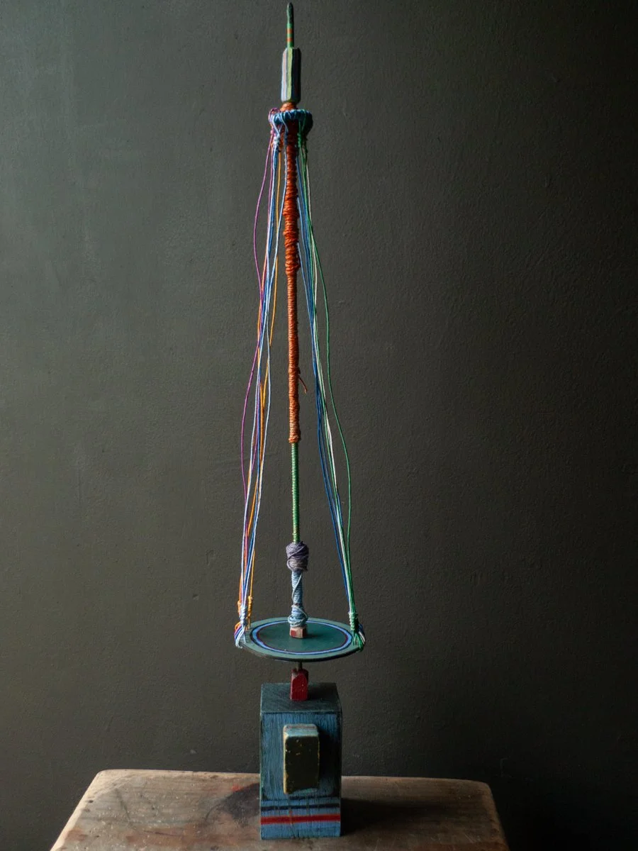 A handmade sculpture with colorful strings, yarn, and wires hanging from a vertical rod mounted on a square wooden base, set against a plain dark wall.